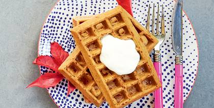 - Liekot pa piciņai sakarsētas vafeļu pannas vidū, izcep mazas vafelītes. Pasniedz siltas, pārlejot ar dzērveņu mērci.