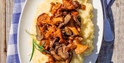 - Zupu sadala porcijās, virsū liek atliktos sēņu gabaliņus, grezno ar mazu timiāna vai rozmarīna zariņu un tējkaroti krējuma.
