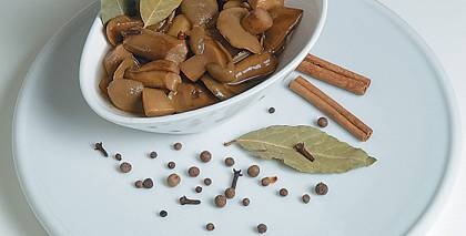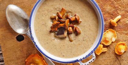 - Tad izņem smukākos sēņu gabaliņus un atliek greznošanai, izņem arī timiāna zariņus un laurlapu, zupu sablendē.
