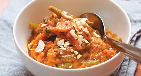 - Tad liek klāt sasmalcinātu sīpolu, salmiņos sagrieztu burkānu un papriku, 4 daļās sagrieztas sēnes, sagrieztu čili un zivju mērci, lēni vāra pāris minūtes.