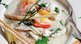 - Pielej kokospienu, daiviņās sagrieztu laimu un sakapātu koriandru, vāra vēl pāris minūtes.