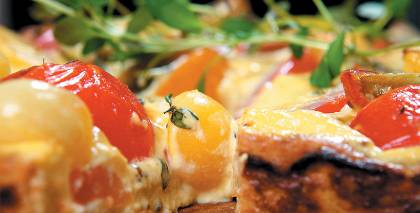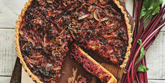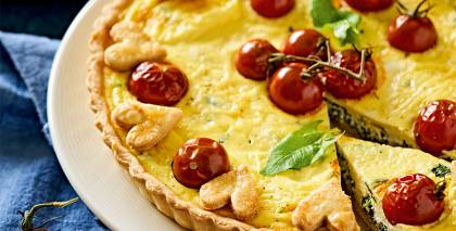 8. Izņem no cepeškrāsns, pārsedz ar lielu šķīvi un izgāž uz tā, ar pildījumu uz augšu. Tarti pasniedz karstu.