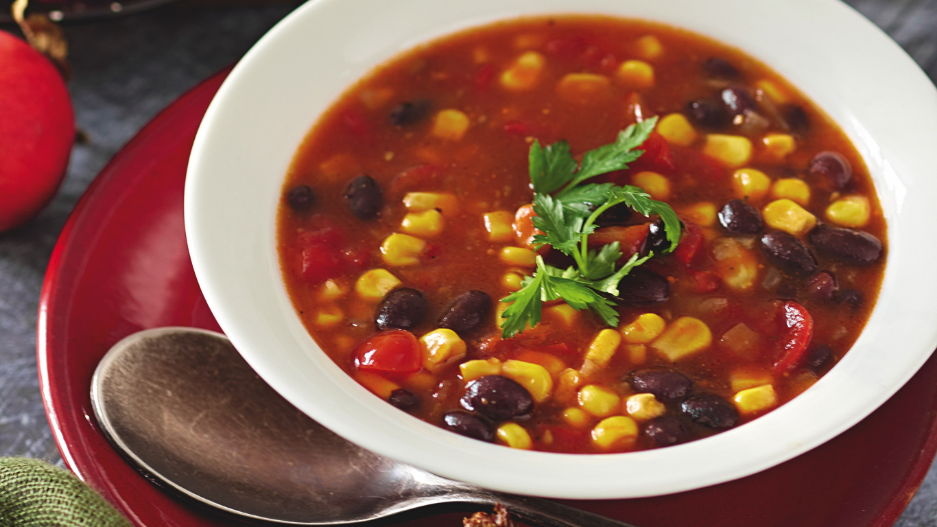 Ātrā tomātu zupa ar pupiņām un kukurūzu