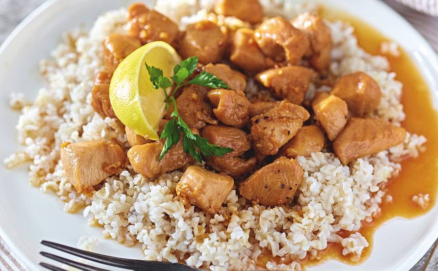 Vistas gabaliņus ar visu mērci pasniedz uz izvārītajiem rīsiem.