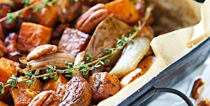 - Batātes ar dakšiņu sadursta, liek pannā uz ieklāta cepampapīra un apgrozot cep mīkstas – apmēram 50–60 minūtes.