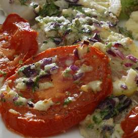 - Virsū liek ceptu līdakas fileju, klāt pieliek ķirštomātiņu pusītes.