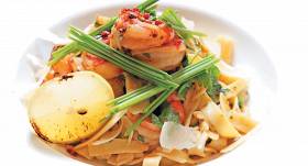 - Liek klāt saberztus ķiplokus un makaronu ligzdiņas. Dažas minūtes cep, līdz ligzdiņas apakšā ir gaiši brūnas, tad uzmanīgi apgriež uz otru pusi.