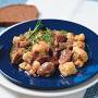 - Gaļu sagriež nelielos gabaliņos, pannā sakarsētā eļļā apgrozot strauji apcep, pārkaisa ar sāli un pipariem un no pannas noņem.