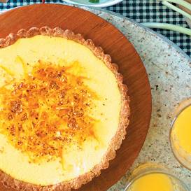 - Masu klāj padzesētā tartes pamatnē, cep 30–35 minūtes – zeltainu. Izceptu pēc patikas pārklāj ar citrusaugļu šķēlītēm, noņemot tām biezo mizu, greznojumu papildina ar avenēm.