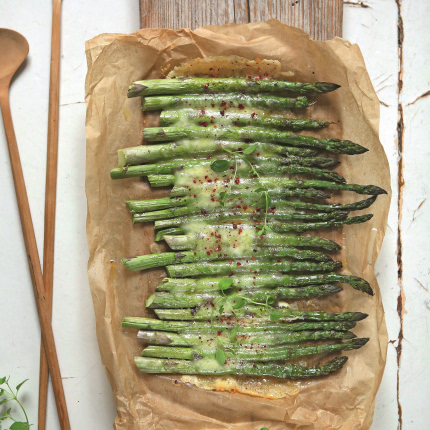 - Uz katras liek gabaliņu siera, tam virsū – atkarībā no lieluma – pa 3–4 sparģeļiem.