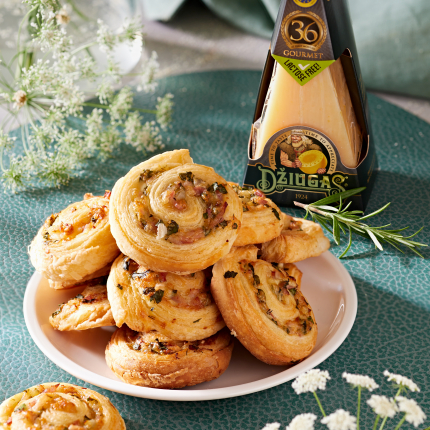 - Cīsiņus pārgriež uz pusēm, liek joslas galā uz siera, saveļ ciešā rullītī.