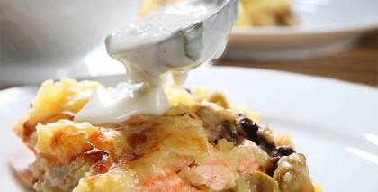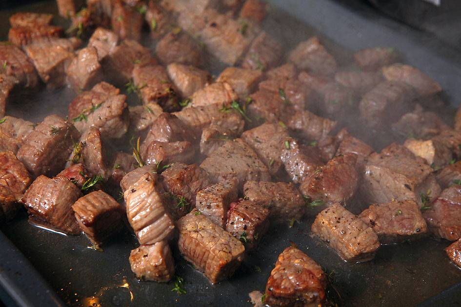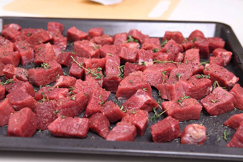 Uzkarsē cepeškrāsni līdz 250 grādiem (ja ir tāda opcija, var pat 300). Kamēr silst krāsns, katlā izkausē trešdaļu paciņas sviesta un viegli apcep smalkos pusgredzenos sagrieztus sīpolus. Gaļu sagriež sīkākos gabaliņos, apber ar sāli, svaigi maltiem pipariem, pa šķipsnai timiāna un rozmarīna. Liek vienā kārtā uz ieeļļotas cepešplātnes un šauj cepeškrāsnī.