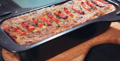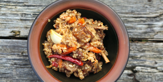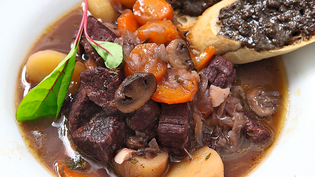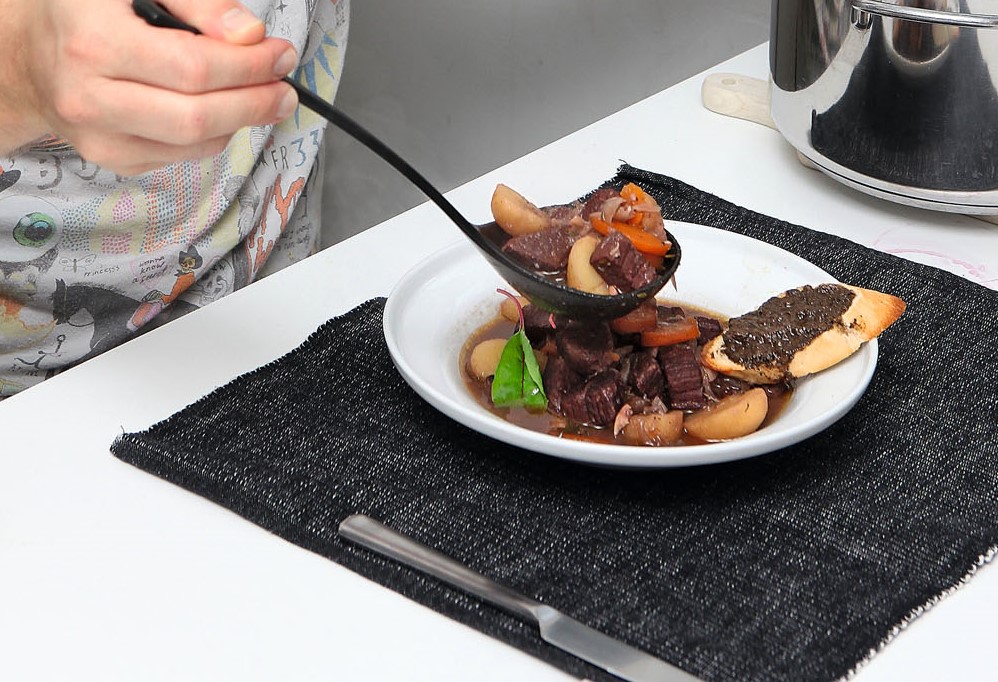 Liellopa gaļas sautējumu Uģis iesaka pasniegt ar svaigas bagetes šķēlēm, kas apgrauzdētas cepeškrāsnī un un pārziestas ar medu, sajauktu ar kaņepju aizdaru.
