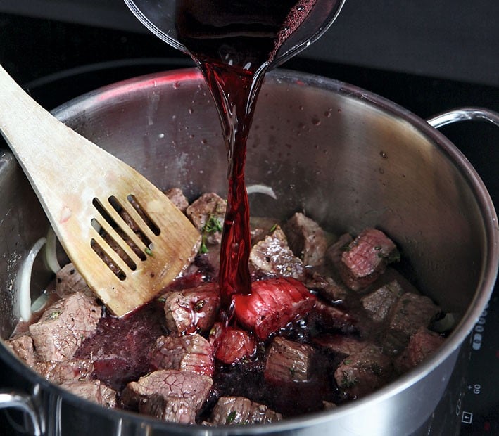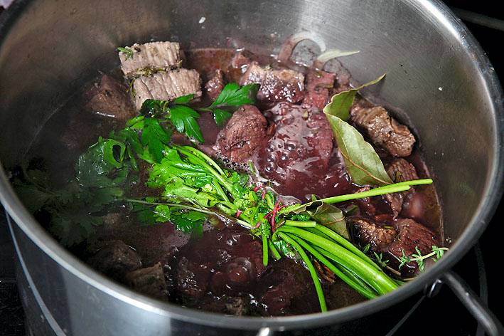 Apcepto gaļu pārvieto katlā pie apceptajiem sīpoliem, pievieno smalki sagrieztus ķiplokus. Gaļu pārlej ar sarkanvīnu – tā, lai tas to tik tikko pārklātu.