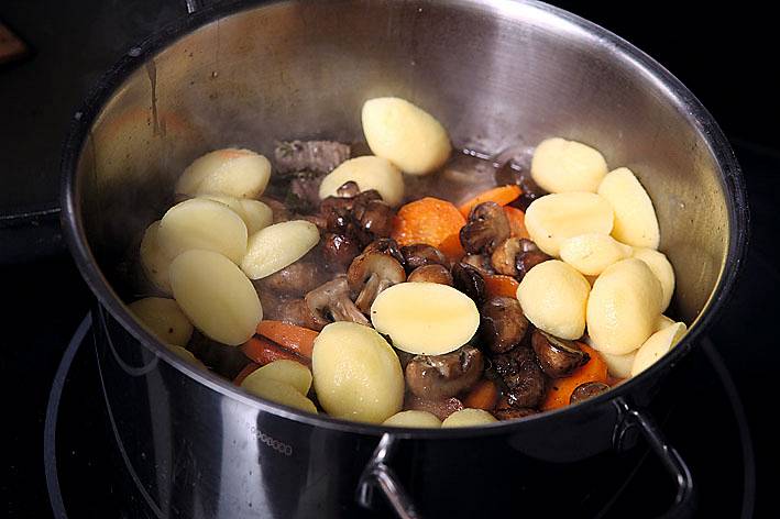 Visu uz nelielas uguns vāra aptuveni divas vai pat trīs stundas, līdz gaļa pavisam mīksta. Uz pusēm pārgrieztus nelielus kartupeļus sautējumam pievieno minūtes 10–15 pirms gatavošanas beigām, lai tie neizšķīst.