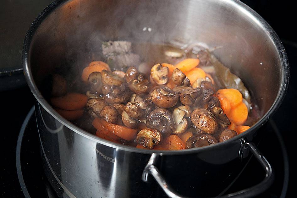 Burkānus un sēnes var likt klāt sautējumam pašā sākumā, bet var arī mazliet vēlāk – tad tie pēc divu stundu vārīšanās nebūs tik mīksti un pašķīduši. Burkānus pirms pievienošanas sautējumam sagriež ripiņās un apcep eļļā, kurai pievienots nedaudz koriandra sēklu. Atsevišķi apcep arī uz pusēm pārgrieztas sēnes. Apceptos burkānus un sēnes, kā arī parupjos gabaliņos sagrieztu pētersīļa sakni liek pie gaļas.
