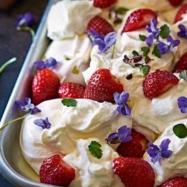 - Tad saputo pārpalikušos 200 g krējuma ar 1–2 tējkarotēm cukura un vaniļas cukuru. Ja kūku paredzēts ilgāk uzglabāt, putojumam var pievienot krējuma biezinātāju.