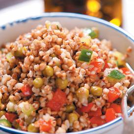 - Griķus vāra sālsūdenī al dente (15 minūtes), nokāš, noskalo ar aukstu ūdeni, notecina, ļauj apžūt.