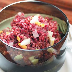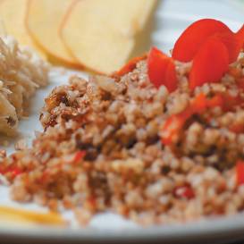 - Liek pie vārītajiem griķiem, pārlaista dažas ēdamkarotes eļļas, pāris ēdamkarotes čili mērces un citrona sulas, visu sajauc, pēc garšas pievieno sāli un piparus.