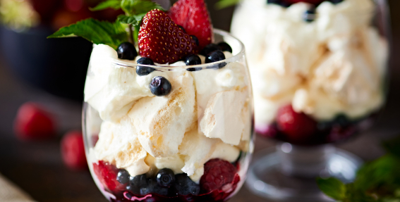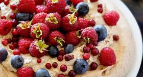 - Beigu beigās pagatavo putukrējumu, sakuļot cukuru ar saldo krējumu un šķīstošo kafiju. To liek pamatnes viducī, tad virspusē bagātīgi dekorē ar svaigām ogām.