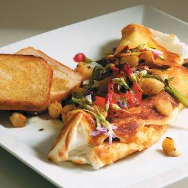- Kad omlete aizlocīta, līdz panna sašaurinās un vairs nav vietas, atlikušo maliņu pieloka no otras puses.