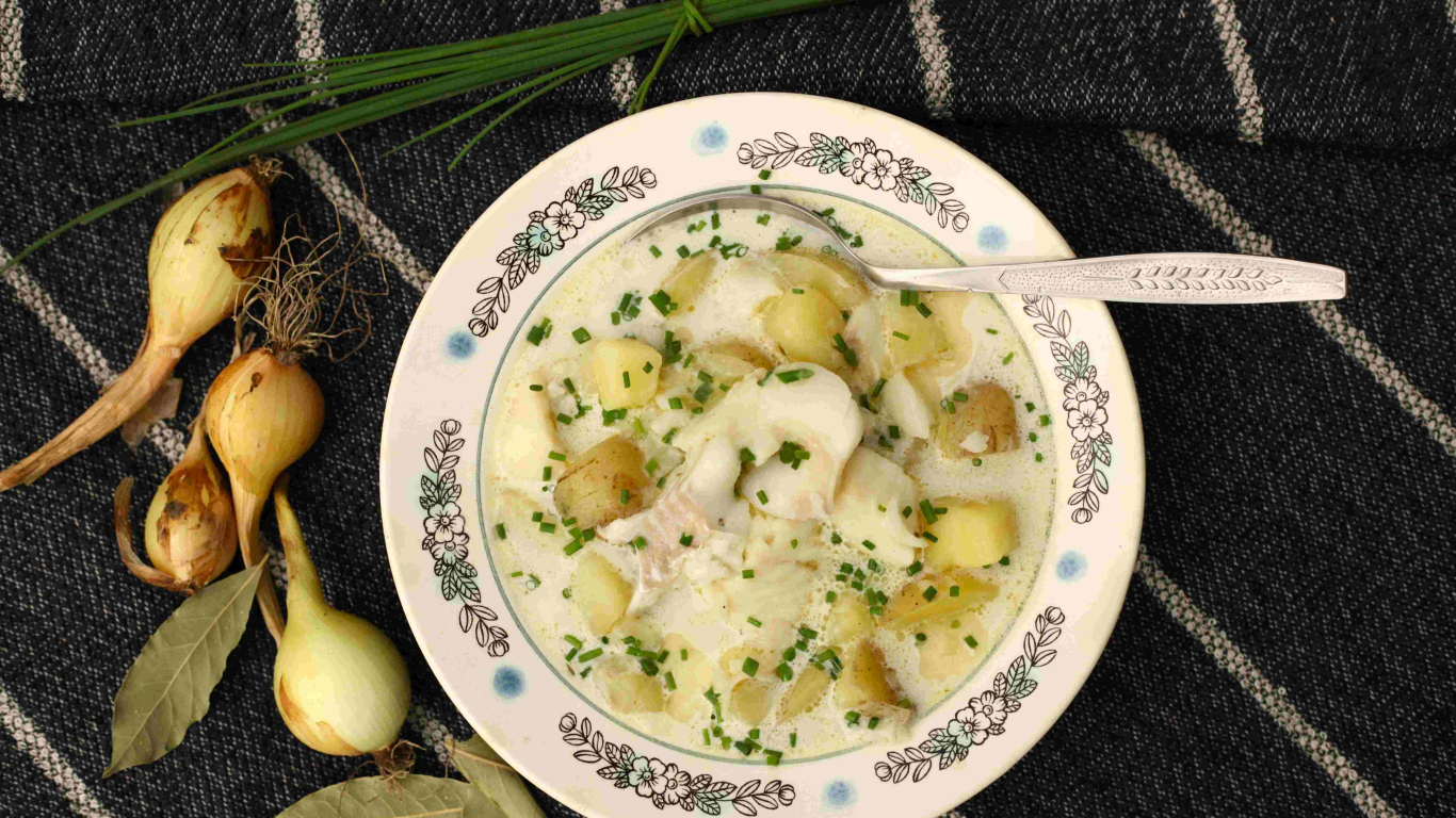 Jauno kartupeļu zupa ar mencu. Mēli var norīt!