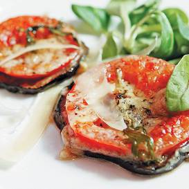 - Baklažānus pasniedz ar tomātu mērci, apceptām tomātu pusītēm un pārkaisa ar sasmalcinātām pistācijām.