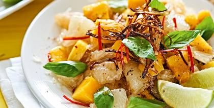 - Pomelo īpaši labi saderēs ar dažādiem zaļo lapu salātiem, avokado, svaigām piparmētras lapiņām, kādu asāku čili piedevu, laima vai citrona sulu, granātābola sēkliņām. Ja vēl salātiem pievienos jūras veltes – piemēram, garneles –, sanāks lieliska, viegla maltīte.