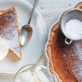 - Sastingušu kūku pirms pasniegšanas grezno ar putukrējumu, kam pievienota 1 ēdamkarote cukura un 1 tējkarote vaniļas cukura, rudens avenēm un piparmētru lapiņām. Ja ir, var pārkaisīt žāvētu aveņu gabaliņus.