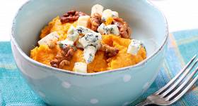 - Ceptās batātes dziļi visā garumā iešķeļ, piepilda ar sagatavoto maisījumu, pārber atlikušo sieru. Liek krāsnī (atkal 200 grādu temperatūrā) un cep aptuveni 15 minūtes, līdz siers ir pakusis un pildījums izkarsis.