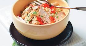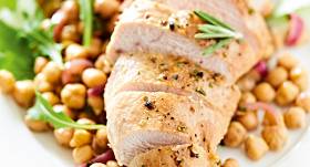 - Blakus vai plauktu zemāk vienlaikus liek pannu ar iepriekš sagatavotiem dārzeņiem – maziem burkāniņiem, vairākās daļās sagrieztiem pastinakiem, biezām cukīni vai kabacīša šķēlēm, nelielos gabalos sagrieztiem kartupeļiem, sīpolu gredzeniem, kas pārlieti ar eļļas, balzametiķa, medus, sinepju, nedaudz sāls un piparu maisījumu, labi visu sajaucot, klāt var pielikt citrona daiviņas vai šķēlītes.