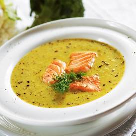 - Pievieno jūras velšu maisījumu, pārkaisa sāli un čili pārslas, iemaisa, visu izkarsē, bet nevāra un pievieno zupai katlā.