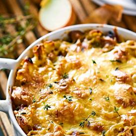 - Ja katls vai panna, kurā ēdiens gatavots, nav piemērots cepšanai krāsnī, ēdienu pārceļ cepamtraukā, pārklāj ar plēstiem mocarellas gabaliem, liek krāsnī, 200 grādu temperatūrā cep 15–20 minūtes.