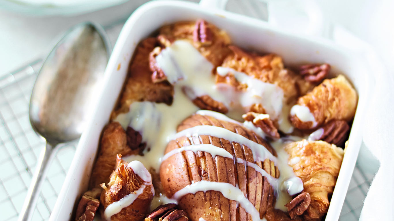 Kruasānu un bumbieru sacepums ar vaniļas mērci