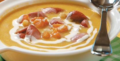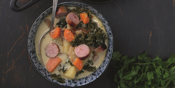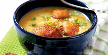 - Kad kartupeļi mīksti, tos ar stampiņu saspaida vai zupu viegli sablendē (uzmanīgi un nedaudz, lai nesaiet klīsterī).