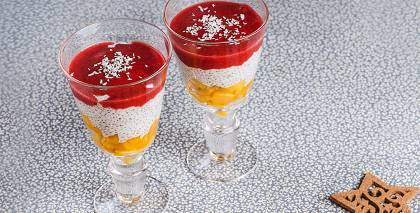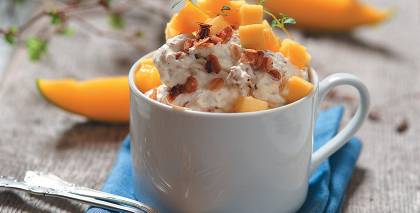 - Nomizotu mango sagriež mazos gabaliņos, iemaisa jogurtā, sadala 4 glāzēs.