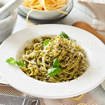 - Atlikušo pesto iemaisa izvārītajos makaronos, uzmanīgi iemaisa arī cukīni šķēles un tomātiņus, pēc vajadzības pievieno sāli un piparus.