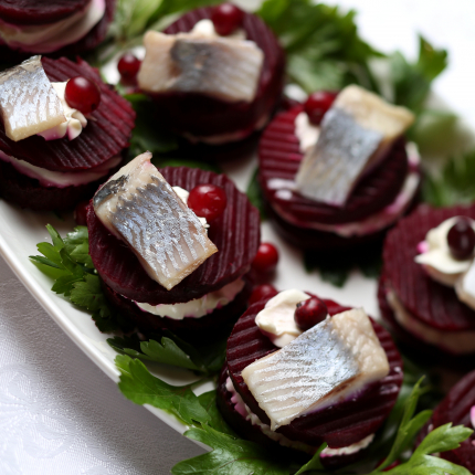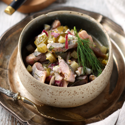 - Nelielā traukā kārtām liek reņģes, starp kārtām liek sīpolu ripiņas un burkānus no marinādes. Pārlej marinādi un liek aukstumā ievilkties līdz nākamajai dienai.