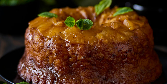 - Pagatavo ruma mērci. Brūno cukuru pannā vai katliņā izkausē un ļauj nedaudz sabrūnēt, pievieno 30 g sviesta, ļauj tam izkust, tad iemaisa 50 g krējuma, uzkarsē, no plīts noņem, atdzesē un iemaisa rumu. Pirms sagriešanas un pasniegšanas mērci pārlaista kūkai.