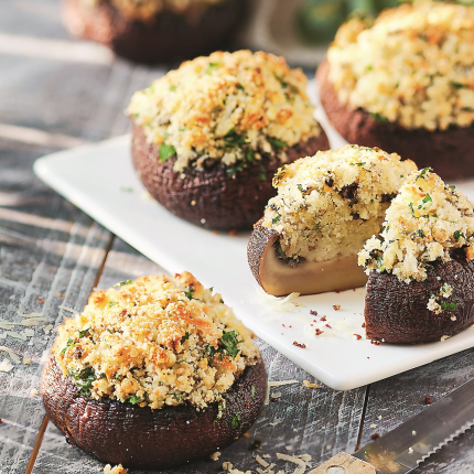- Arī sēņu iekšpusi iesmērē ar eļļu, pārkaisa ar Vidusjūras garšaugu maisījumu.