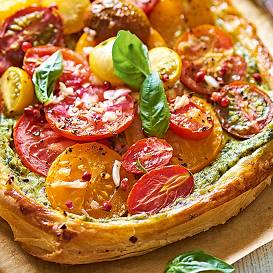 - Izrullētu ieklāj ar taukvielu iesmērētā vai ar cepampapīru izklātā 30 × 36 cm cepampannā, virsū klāj krēmsieru, pārkaisa ar sakapātiem zaļumiem, pārliek ar lielākām un mazākām krāsainu tomātu šķēlēm un mazo tomātiņu pusītēm, iestarpinot arī mini mocarellas bumbiņas vai gabaliņos sadalītu mocarellas bumbu.