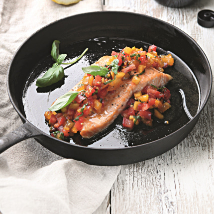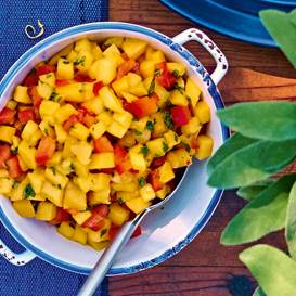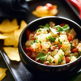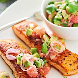 - Gatavās karbonādes kārto uz šķīvjiem un pārslaka ar šķidrumu, kas izveidojies pannā. Pāri kārto augļu salsu.