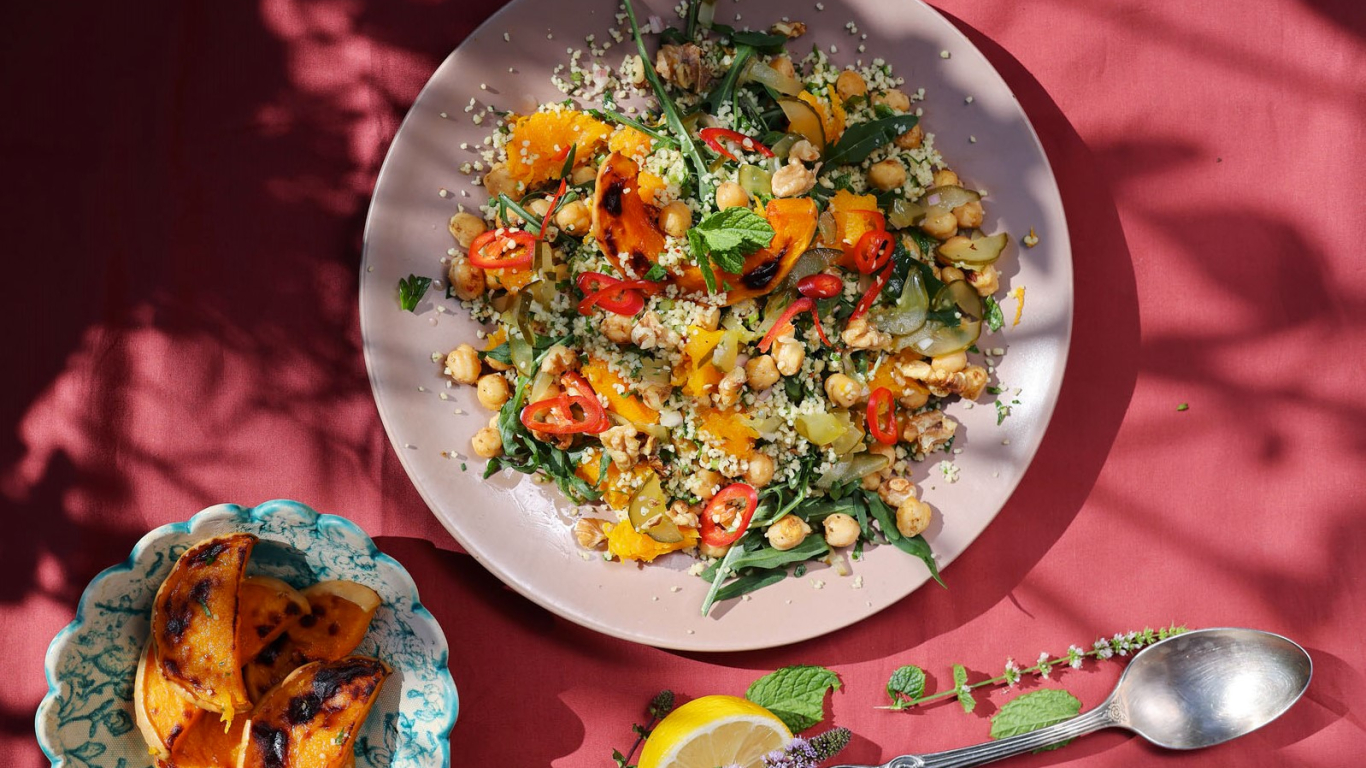 Salāti ar ceptu ķirbi, kuskusu un turku zirņiem