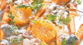 - Salātus sadala porcijās, virsū liek cepto sieru, pārber granātābola sēklas, pārlaista pagatavoto mērci.