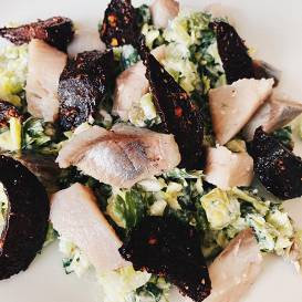 - Visas sastāvdaļas liek salātu bļodā, uzmanīgi samaisa, pievieno eļļu, svaigi maltus melnos piparus pēc garšas.
