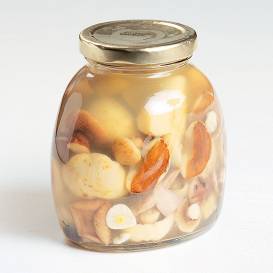- Sēnes piespiežot cieši sablīvē, lai tās ir pārklātas ar izspiestu šķidrumu. Virsū uzliek slogu.