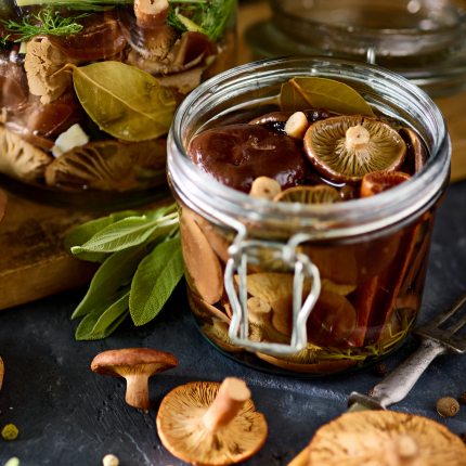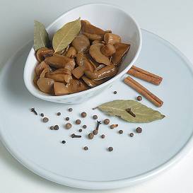 - Pa starpām sēnēm liek klāt ķiploka šķēlītes, laurlapas, dilles un citus garšaugus, pārkaisa piparus.