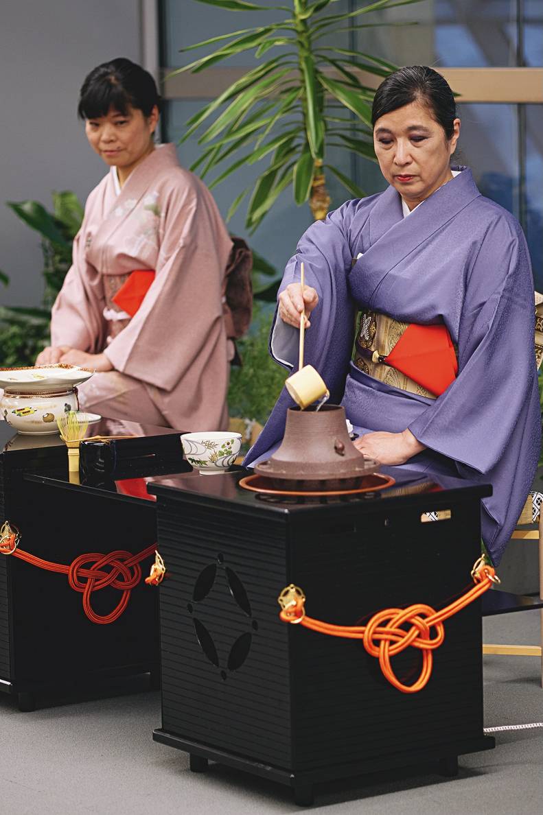 - Ar labās rokas īkšķi un rādītājpirkstu notīra uz tases malas atstātās lūpu pēdas. Pirkstus noslauka saldumu papīrā (tos uz papīra pasniedz ceremonijas sākumā). Tad ar labo roku bļodu divas reizes pagriež pretēji pulksteņrādītāja kustības virzienam, lai tās glītākais elements atkal būtu vērsts pret viesi, un atdod namatēvam.