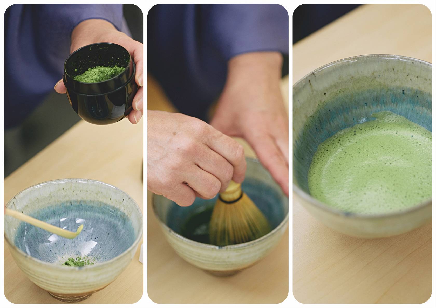 Tasē iemēra matčas pulveri un pārlej ar karsto ūdeni.