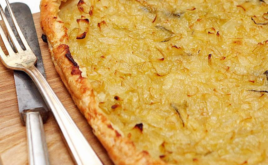 Sātīgā sīpolu pica ar kārtaino mīklu. Tradicionāls franču ēdiens no Nicas!